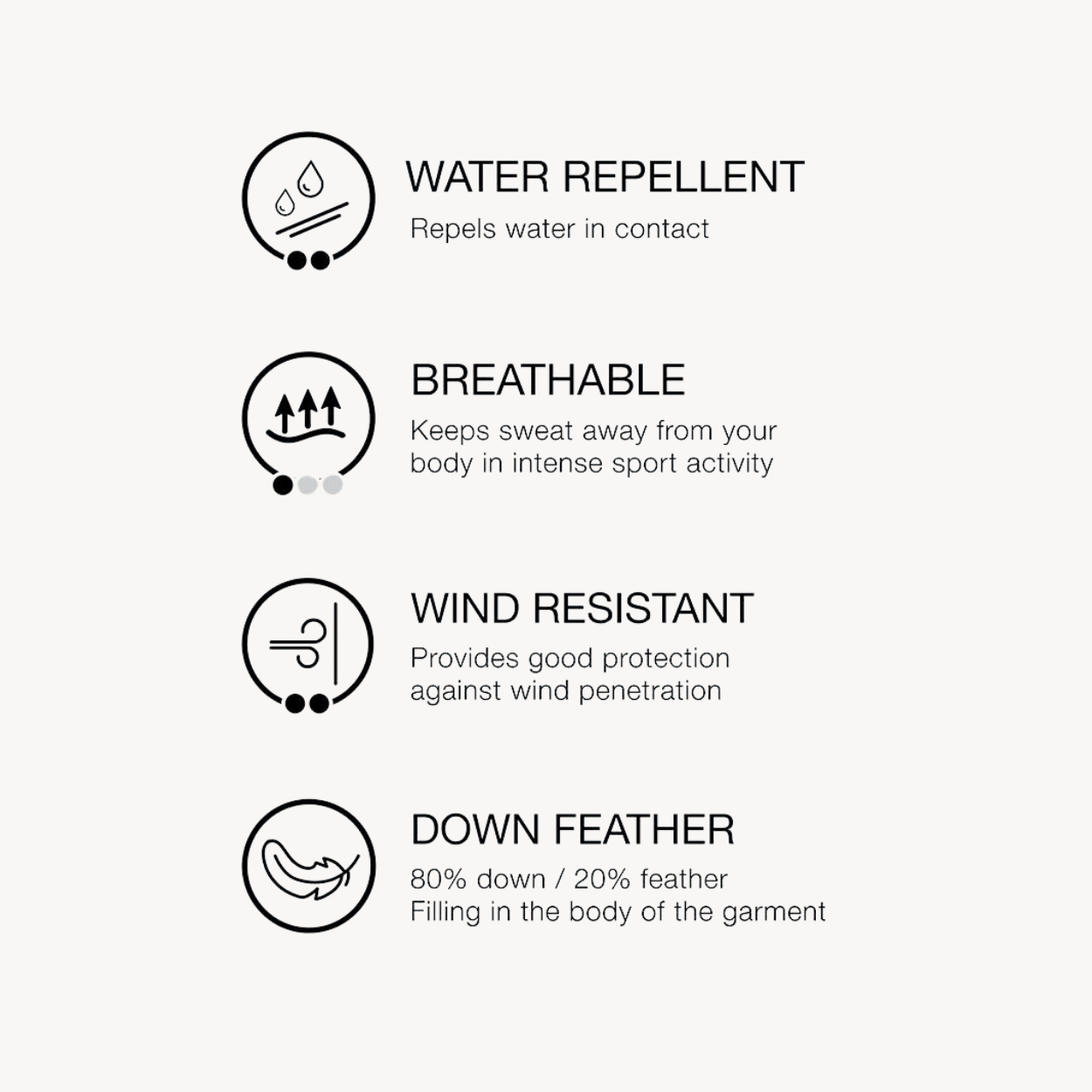 The Montclair jacket combines high-performance design with sleek sophistication. Crafted from glossy technical fabric and filled with a premium blend of feather and down, it offers superior warmth without sacrificing style — ideal for city days or mountain escapes.